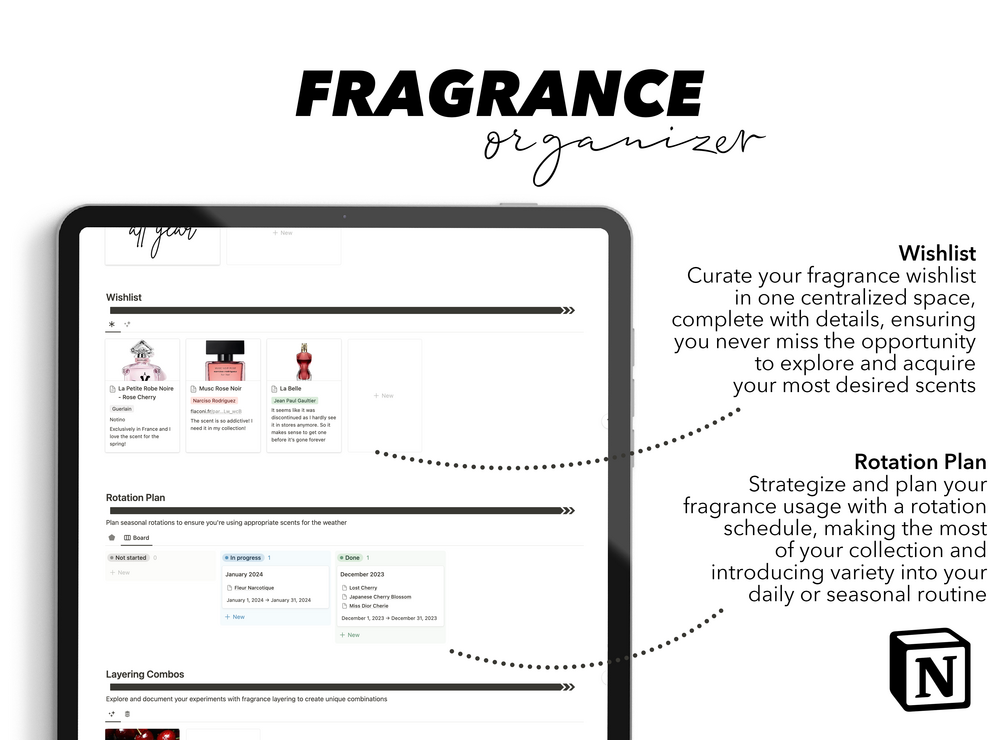 Fragrance Organizer Notion Template to manage your fragrance collection, plan decluttering, layering combos, rotation plans and whishlist