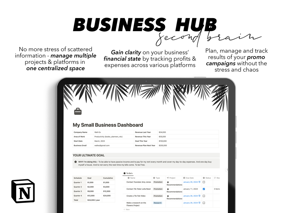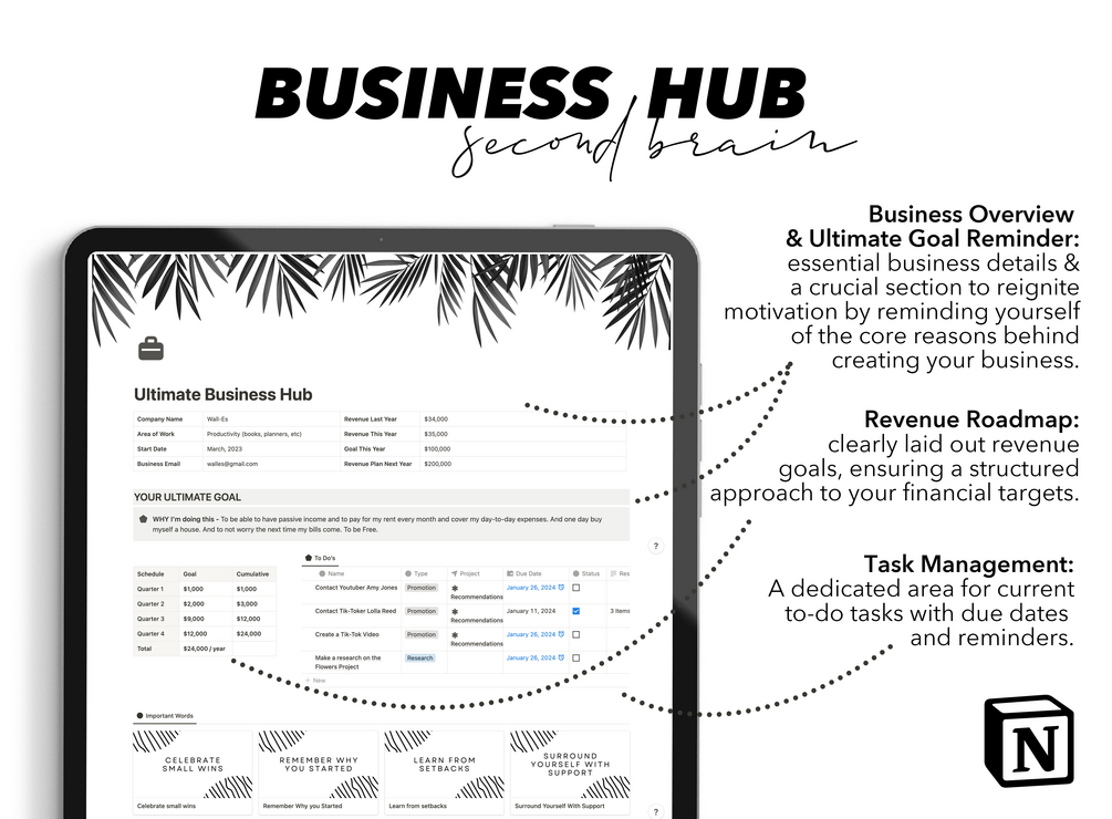 Keywords: Business Dashboard, Business Hub, Business Organizer, Notion Template Business Owner, Small Business Notion Template, That Girl Planner, Ultimate Notion Template, Notion Dashboard, Notion Template Aesthetic, Notion Templates, Notion Planner, All in One Notion Planner All in One Notion Planner, Digital Life Planner, Editable Notion Template, Minimal Aesthetic Planner, Productivity Planner, Productivity Planner, Productivity Tracker