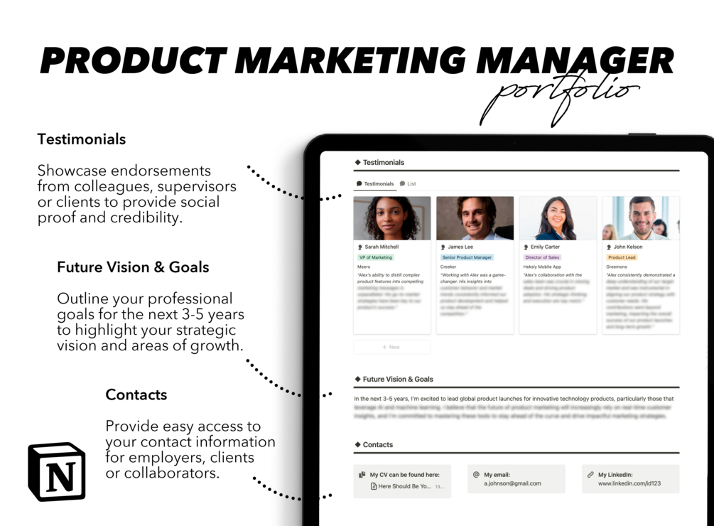 This Notion template is crafted specifically to give Product Marketing Managers the edge they need. It allows you to create a professional, cohesive portfolio that saves you time while ensuring every aspect of your experience and expertise shines through. Whether you’re highlighting your product launch successes, cross-functional collaboration, or results-driven strategies, this template empowers you to communicate your value with impact and precision.
