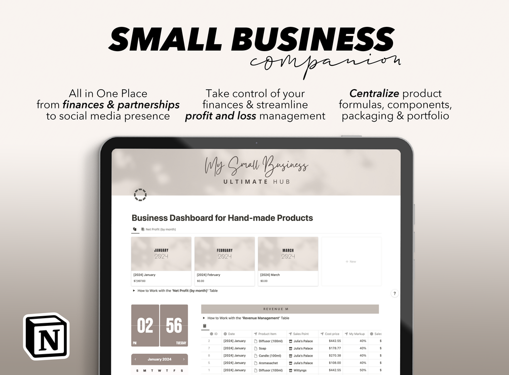 Keywords: Small Business, Handmade Business, Etsy Sellers, Small Business Tools, Crafters Community, Financial Management, Profit Tracking, Social Media Management, Design Resources, Business Dashboard, Business Hub, Business Organizer, Notion Template Business Owner, Small Business Notion Template, That Girl Planner, Ultimate Notion Template, Notion Dashboard, Notion Template Aesthetic, Notion Planner, All in One Notion Planner All in One Notion Planner, Productivity Planner, Productivity Planner, Productivity Tracker